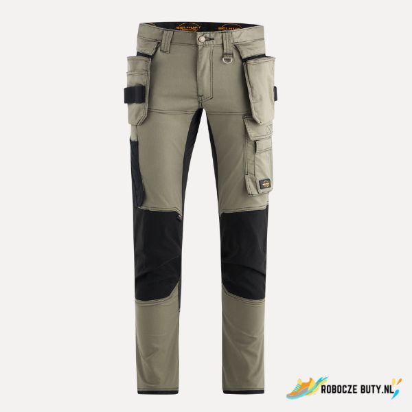 Profilowane i dopasowane zwężane nogawki poprawiają wygląd i styl Slim zapewniając jednocześnie komfort w użytkowaniu i pracy. Na bokach specjalne kieszenie do umieszczenia miarki, noża i ołówka lub innych narzędzi. Dwie wygodne kieszenie przednie, 2 kieszenie tylnie zamykane klapą na rzep, dwie boczne kieszenie na nogawce na narzędzia, Metalowa pętla na umieszczenie kluczy z przodu, Specjalna zaprojektowana kieszeń na telefon typu Smartfon.