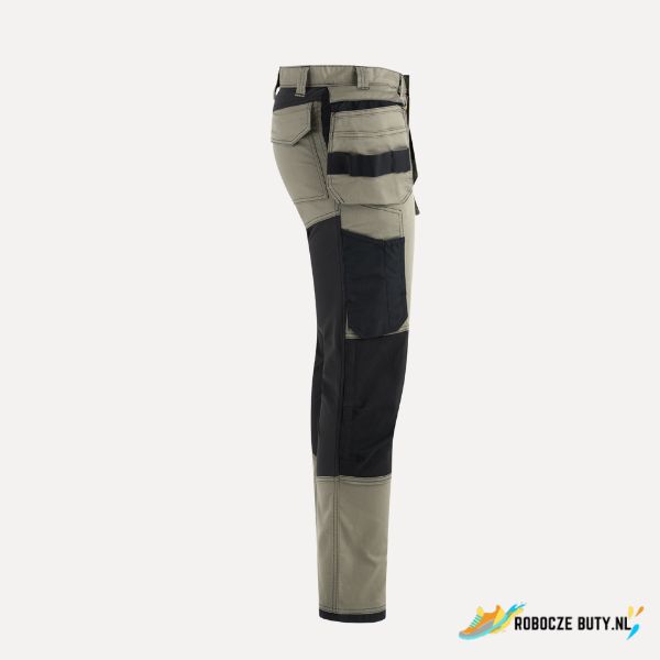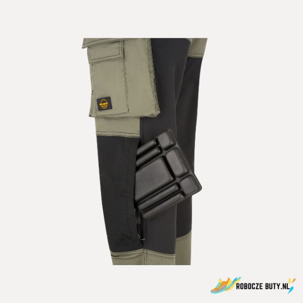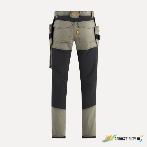 Spodnie Robocze Stretch Khaki. Nowoczesne i eleganckie wykonane z najwyższej jakości oddychającego materiału. Elastyczny rozciągliwy materiał stretch w kroku który został zaprojektowany dla idealnego komfortu i wygody. Specjalny stretch zapobiega rozrywaniu się spodni w kroku. Zrównoważony projekt spodni wykonany na bazie nowej technologii slim fit. Dodatkowy stretch poniżej tylnego pasa który spełnia funkcję rozciągania przy schylaniu się, co dodatkowo zwiększa wygodę ruchu. Dodatkowe workowe wiszące kieszenie na narzędzia z możliwością ich odpięcia specjalnym zamkiem zip YKK! Specjalny wzmocniony oryginalny materiał Cordura wszyty na kolanach który zapobiega przetarciu i wydłuża żywotność spodni. Możliwość umieszczenia nakolanników ochronnych poprawiających komfort przy pracach podłogowych, nakolanniki zamykane zamkiem zip YKK z boku.