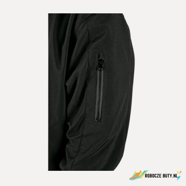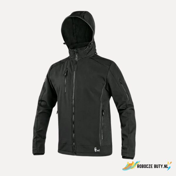 Męska kurtka softshellowa, wodoodporna, odporna na działanie wiatru, odpinany kaptur, rękaw z elastycznym wewnętrznym mankietem, ściągacz w dolnej części, czarne elementy odblaskowe, kołnierz i podszewka z polaru, TPU membrana, odporność na przenikanie wody 10 000 mm poza strefą szwów, paroprzepuszczalność 3 000 g/m2/24 godz. Na lewym rękawie kieszeń na zamek, 2 dolne kieszenie na zamek, kieszeń na piersi na zamek.