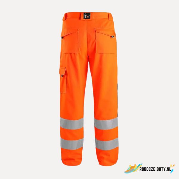 Męskie spodnie ostrzegawcze, pas ze szlufkami na pasek i gumką po bokach, 2 kieszenie z przodu, 2 kieszenie z tyłu, ukryte przednie zapięcie na zamek, z lewego boku kieszeń z mniejszą kieszenią na ołówek, taśmy odblaskowe 3M (szerokość 7 cm). Zalecane zastosowanie: budownictwo, prace drogowe, kierowcy, utrzymanie, logistyka, transport lotniczy i morski, odśmmiecanie, ratownicy.