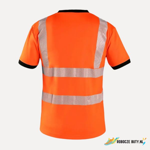 Ostrzegawcza koszulka z krótkim rękawem, kontrastowy brzeg w czarnym kolorze koło szyi i rękawów, V dekolt, taś- ma wzmacniająca koło szyi, wentylacja pod pachami, segmentowe paski odblaskowe: 2 poziome, 2 pionowe (szerokość 5cm) Zalecane zastosowanie: budownictwo, prace drogowe, kierowcy, utrzymanie, logistyka, rower, motocykle, magazyny.