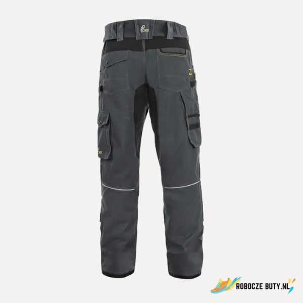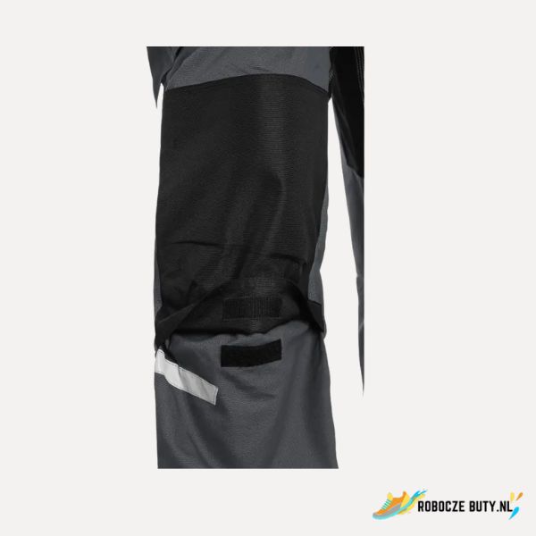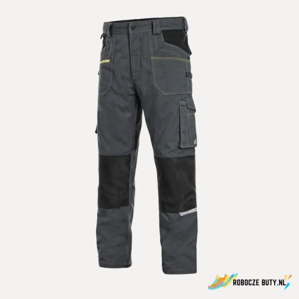 Męskie spodnie robocze, tkanina stretch zapewniająca swobodny ruch, szlufki na pasek, przednie kieszenie z kieszonką na zamek, z boku kieszenie wielofunkcyjne, kolana wzmocnione poliestrem 600D z możliwością włożenia nakolanników, dwie tylne kieszenie – jedna z patką, brzeg nogawek z tyłu wzmocniony poliesterem 600D, elementy odblaskowe. Zalecane zastosowanie: inżynieria, budownictwo, przemysł lekki, motoryzacja, logistyka, magazyn, spedycja, garaż, konserwacja, montaż, rolnictwo, ogród, hobby.