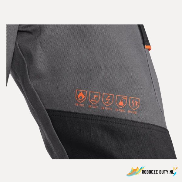 Męskie spodnie ochronne, antystatyczna z trwałą ochroną niepalną PROBAN i obróbką odporną na ciekłe chemikalie typu 6 i PB [6]. Również odpowiednia do pracy pod napięciem zgodnie z normą EN 61482. Pas z gumką po bokach i szlufkami na pasek, przednie i boczne kieszenie na rzep, tylne kieszenie na rzep. Elementy odblaskowe zwiększają bezpieczeństwo w warunkach ograniczonej widoczności. Zalecane zastosowanie: spawacze, przemysł petrochemiczny, energia, gaz i rafinerie, prace pod napięciem, praca na elektrowni wiatrowej.