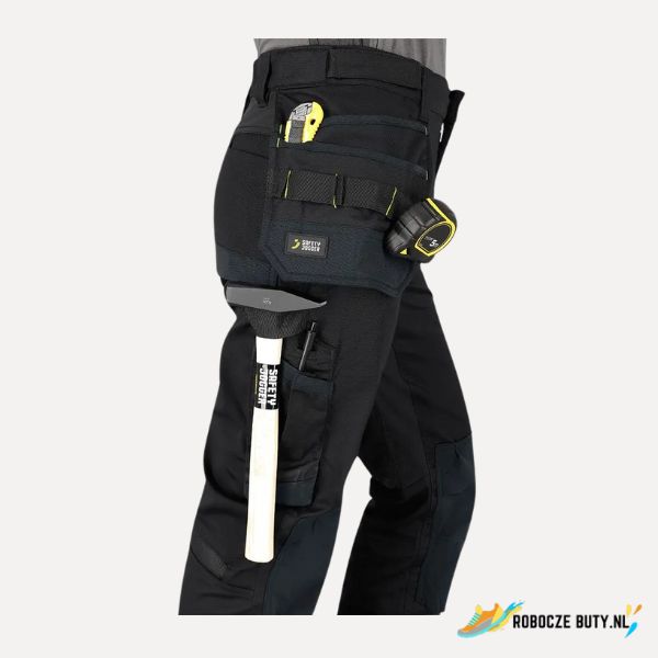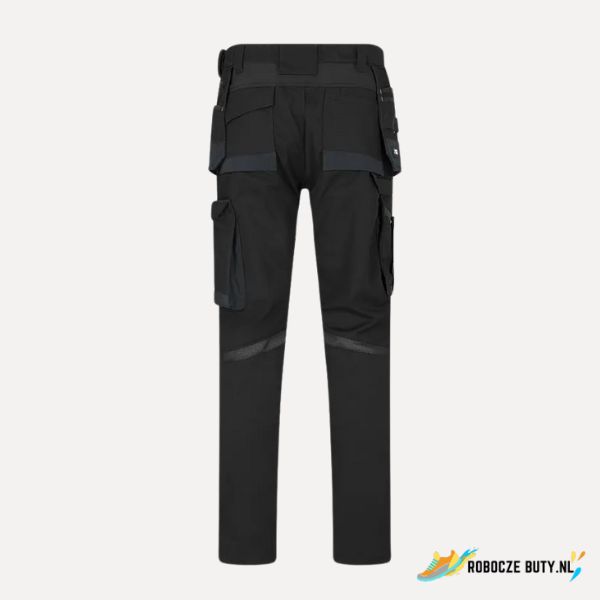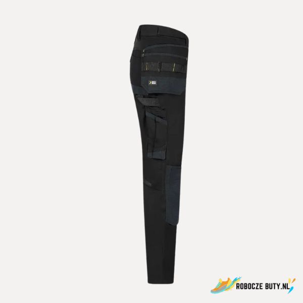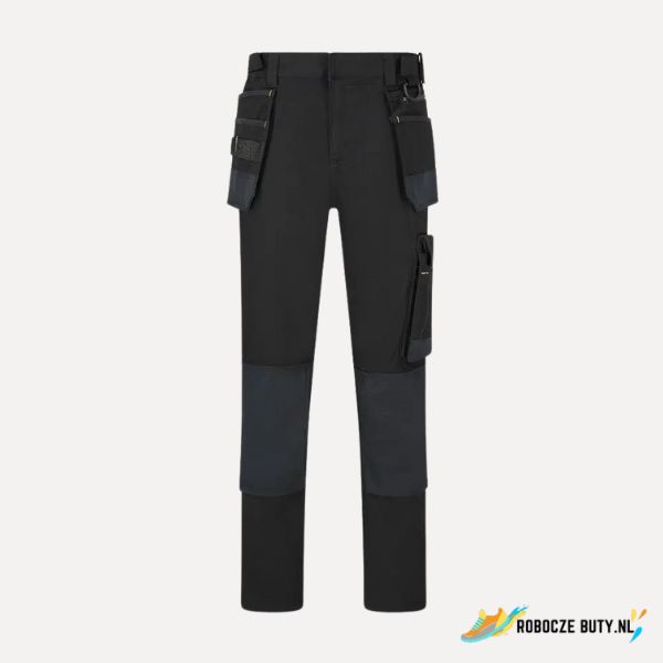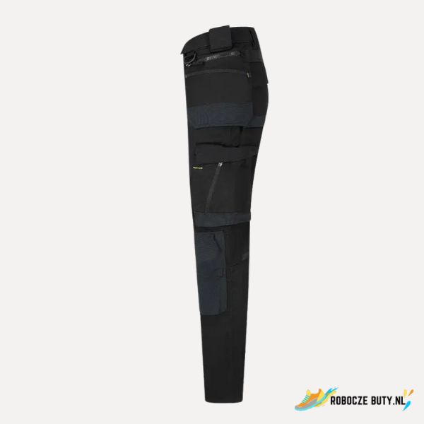Wygodne spodnie robocze z rozciągliwością w 4 kierunkach, wzmocnionymi elementami, stałymi, wiszącymi kieszeniami i funkcjonalnymi detalami.